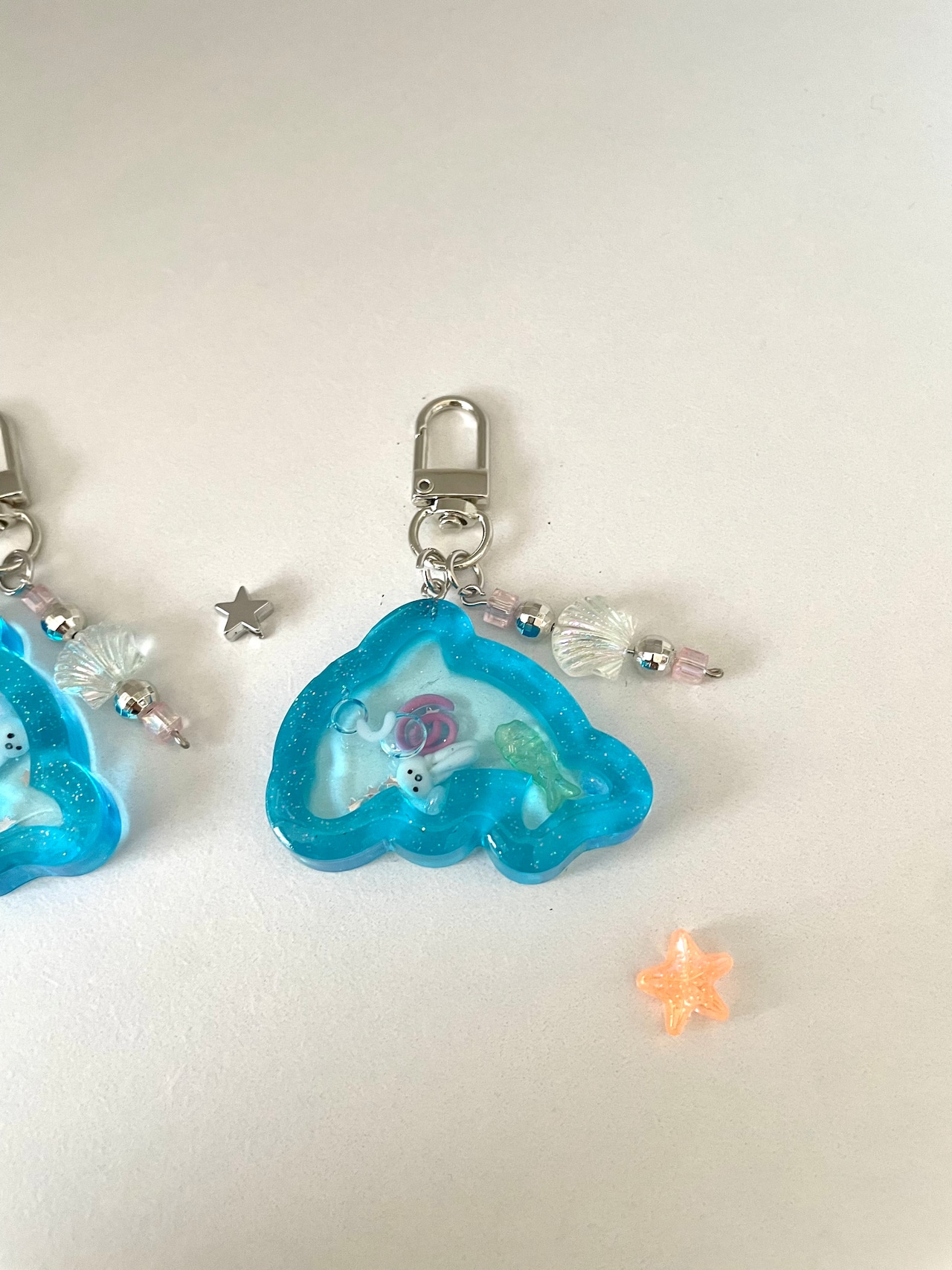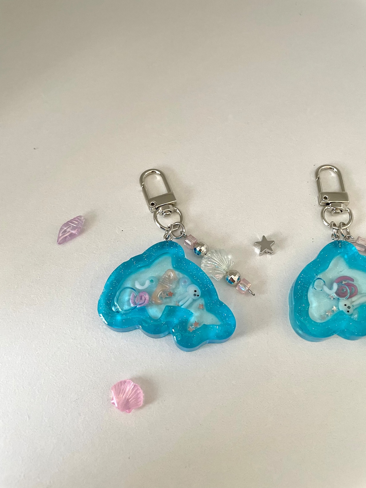 中にはクラゲが入っています!ぐるぐると魚パーツが入っていて夏の爽やかなイメージでつくりました☆小さな星も入っていてキラキラです♫