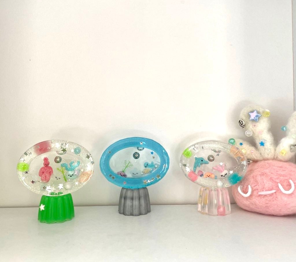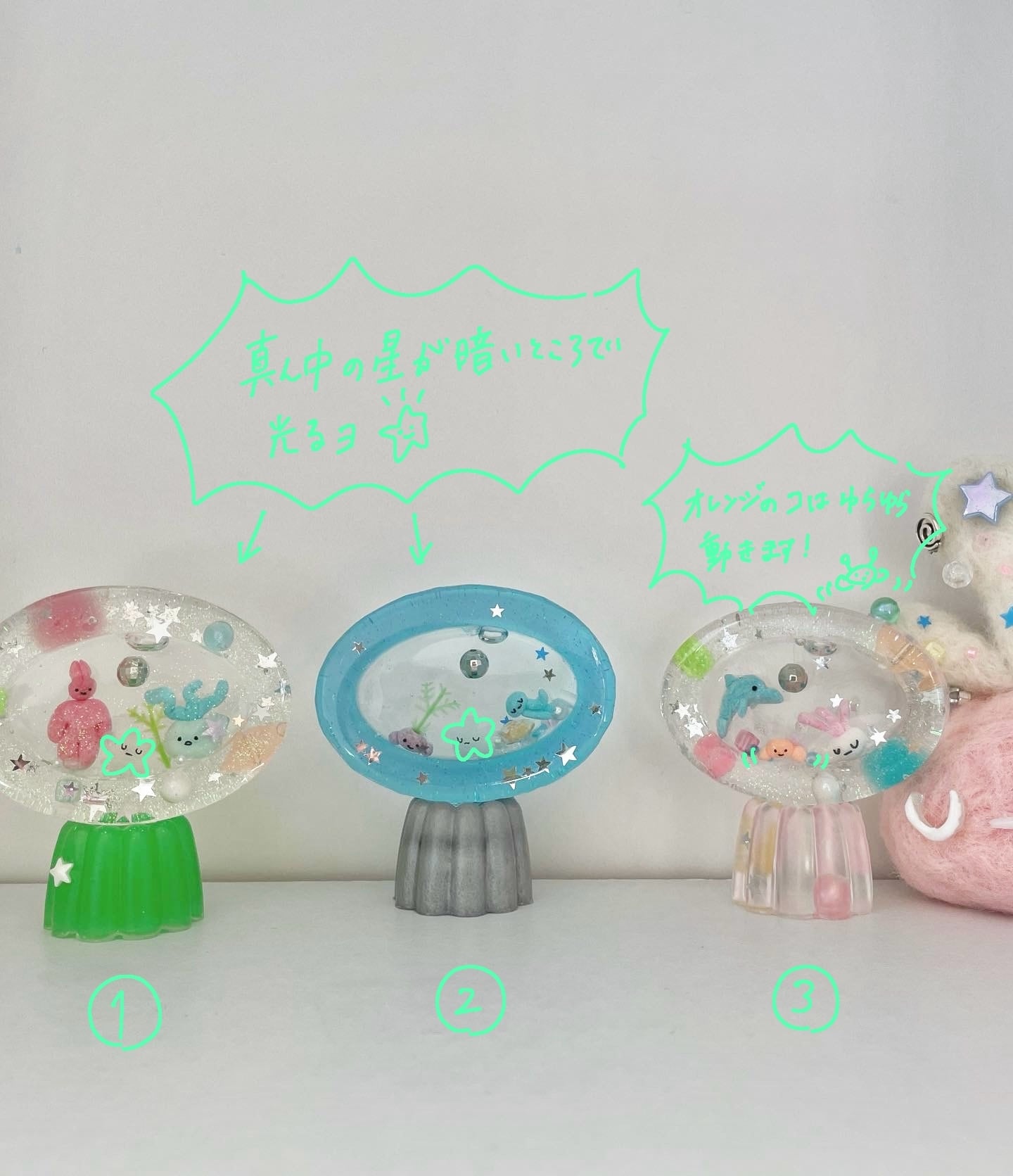 ①②の星は暗いところで光る蓄光です★③のオレンジウー宙人はふるとゆら〜っと動きます!
