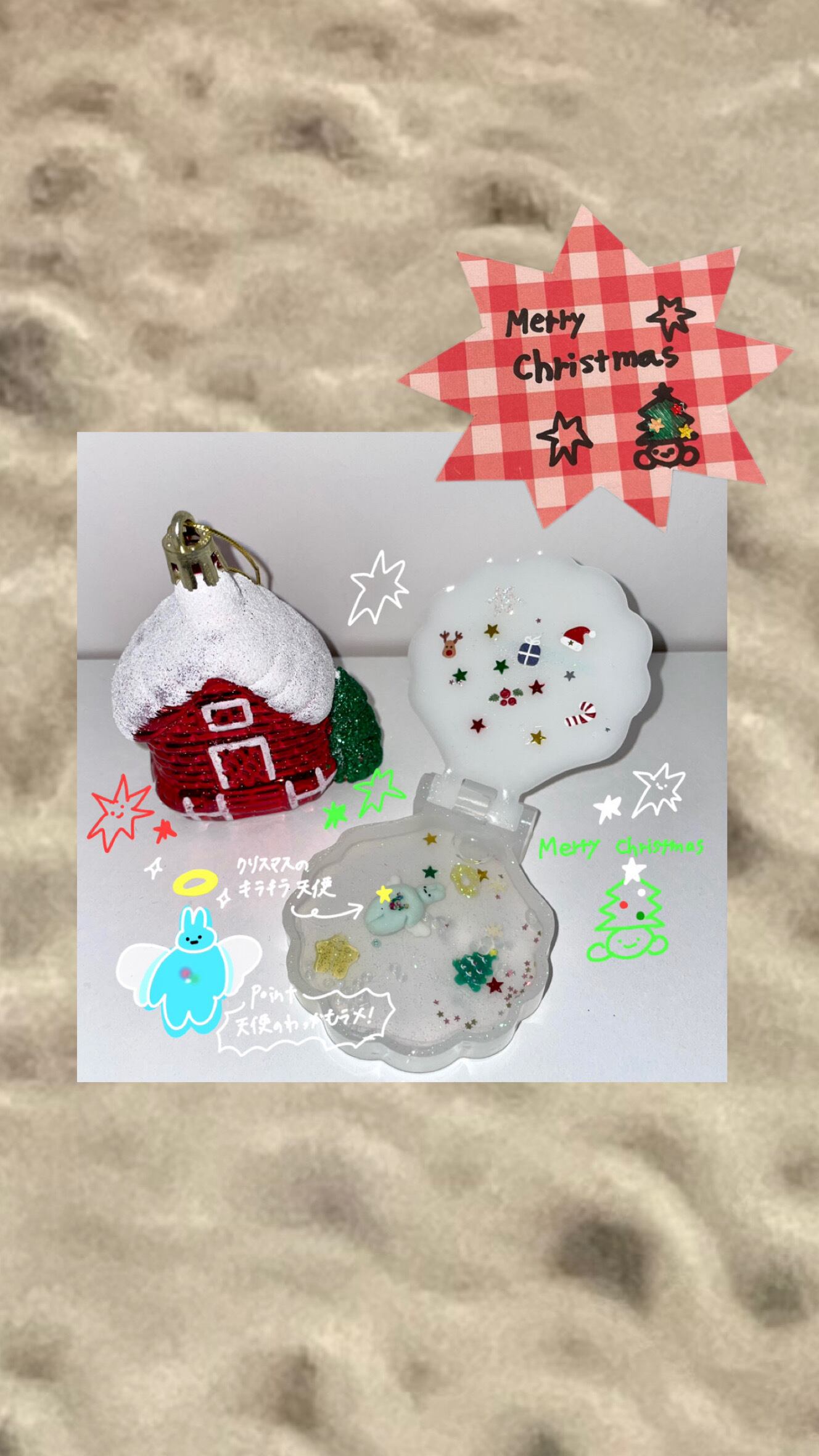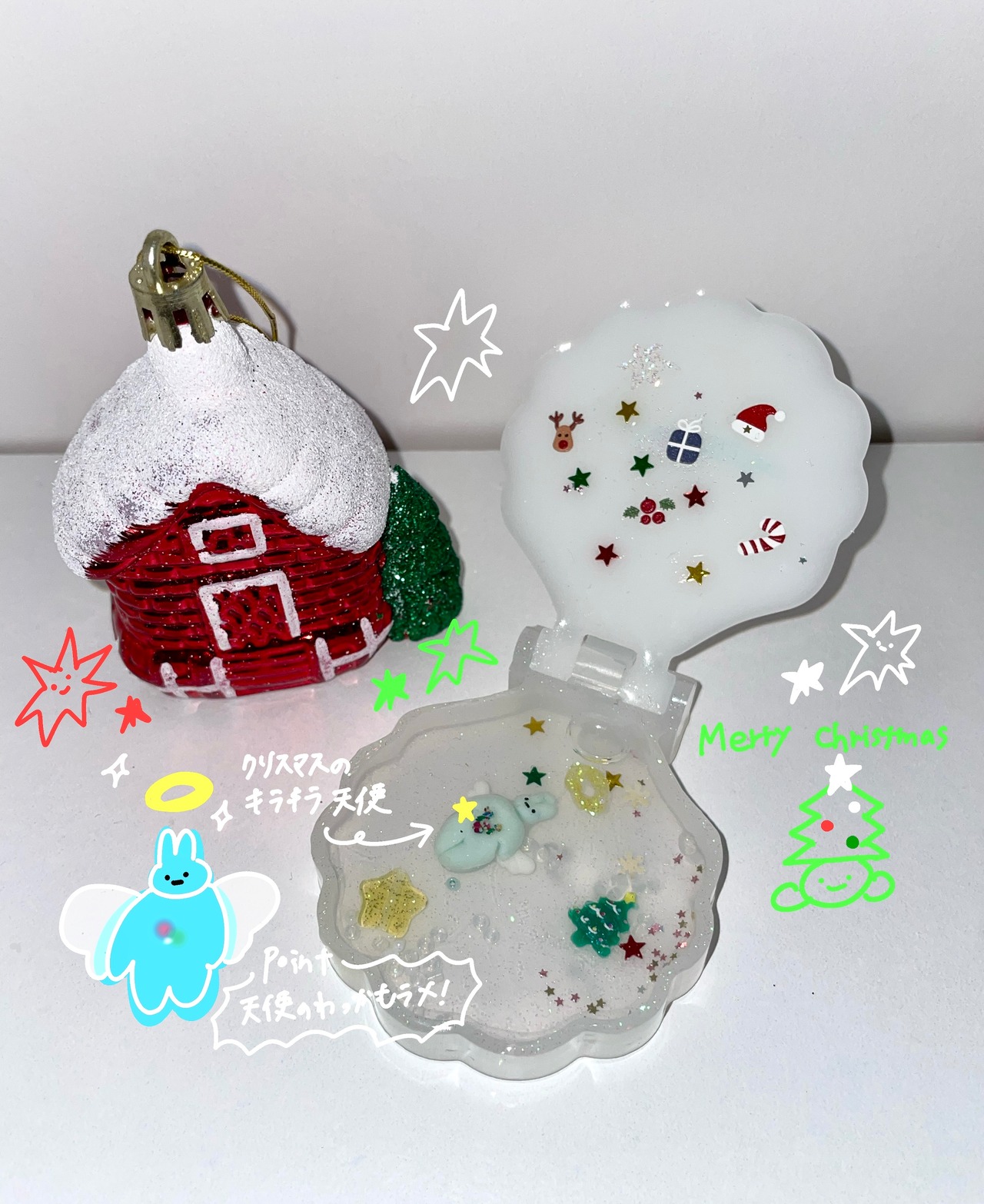 モリモリうさぎのエンジェルバージョンもクリスマスイメージで作製しました。 天使の輪っかラメがポイントです!